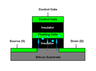 Electrons are released again using the erase voltage. If only a few electrons remain in the floating gate, the state "one" is read because current flows between the source and drain.