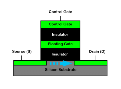 NAND cells are the fundamental component of flash memory. The term «NAND» refers to the logical structure underlying data storage in these cells, specifically NAND logic (NOT-AND). NAND cells operate using a transistor channel (source-drain) and two gates: a control gate and a floating gate. The floating gate is isolated from the control gate and transistor channel by an oxide layer. When electrons are pushed through this oxide layer into the floating gate using storage voltage (via the tunneling effect), they remain trapped there permanently – even without sustained voltage.