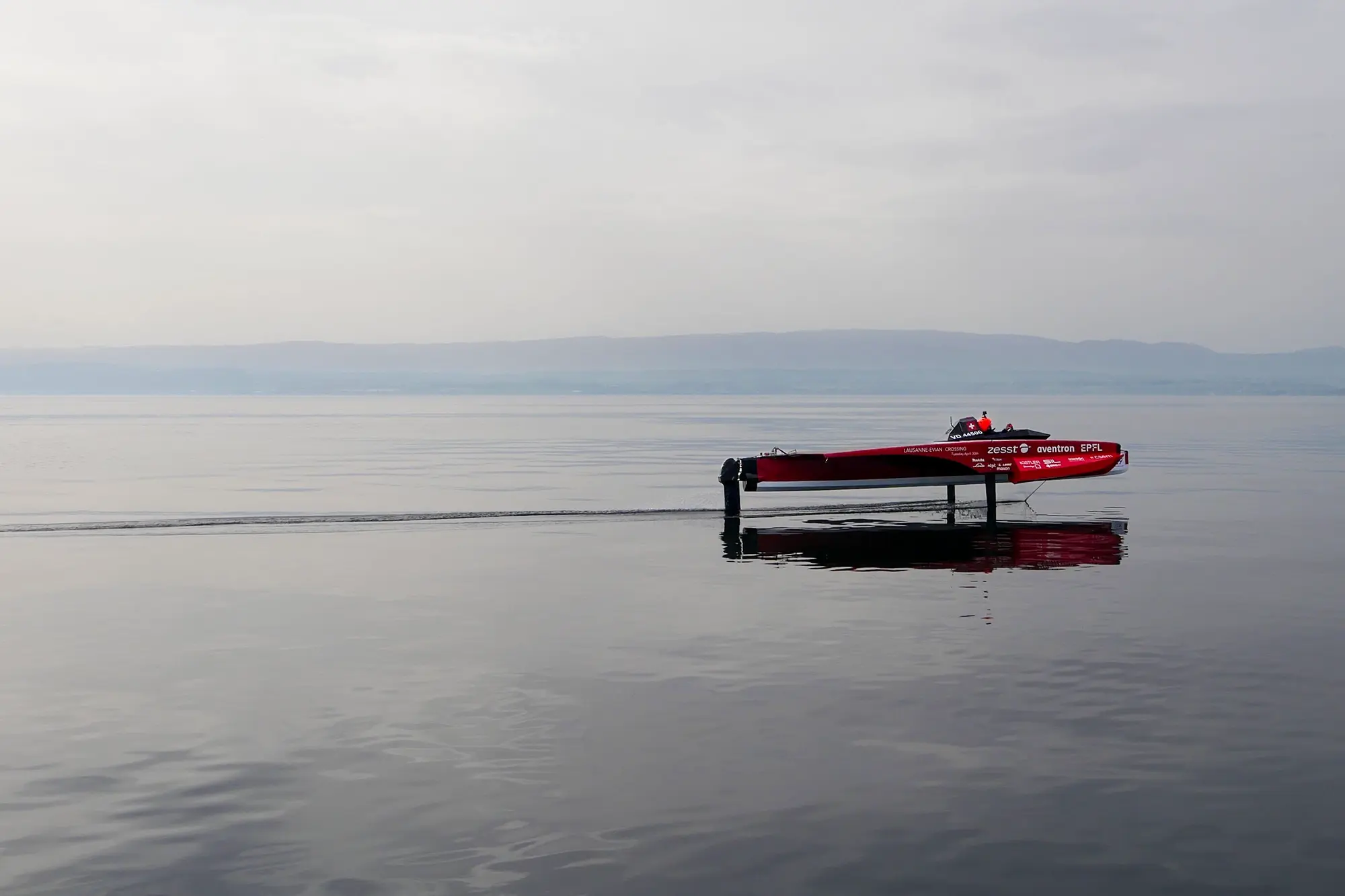 Swiss Solar Boat combines this foiling technology with lightweight construction and ultra-thin solar cells. The Dahu competed in the Monaco Energy Boat Challenge (MEBC) in 2021 and 2022, winning several prizes and awards. However, despite its success, the design had its limitations – particularly in terms of range. To address this, the Dahu was taken back to the workshop for further development. In particular, a hydrogen-electric hybrid system was added to complement the solar cells. The effectiveness of this system was demonstrated in April 2024 when the students successfully crossed Lake Geneva from Lausanne to Évian. The Dahu covered the 13-kilometre distance in just 30 minutes. The range of the Dahu has been tripled by the introduction of the hydrogen system.